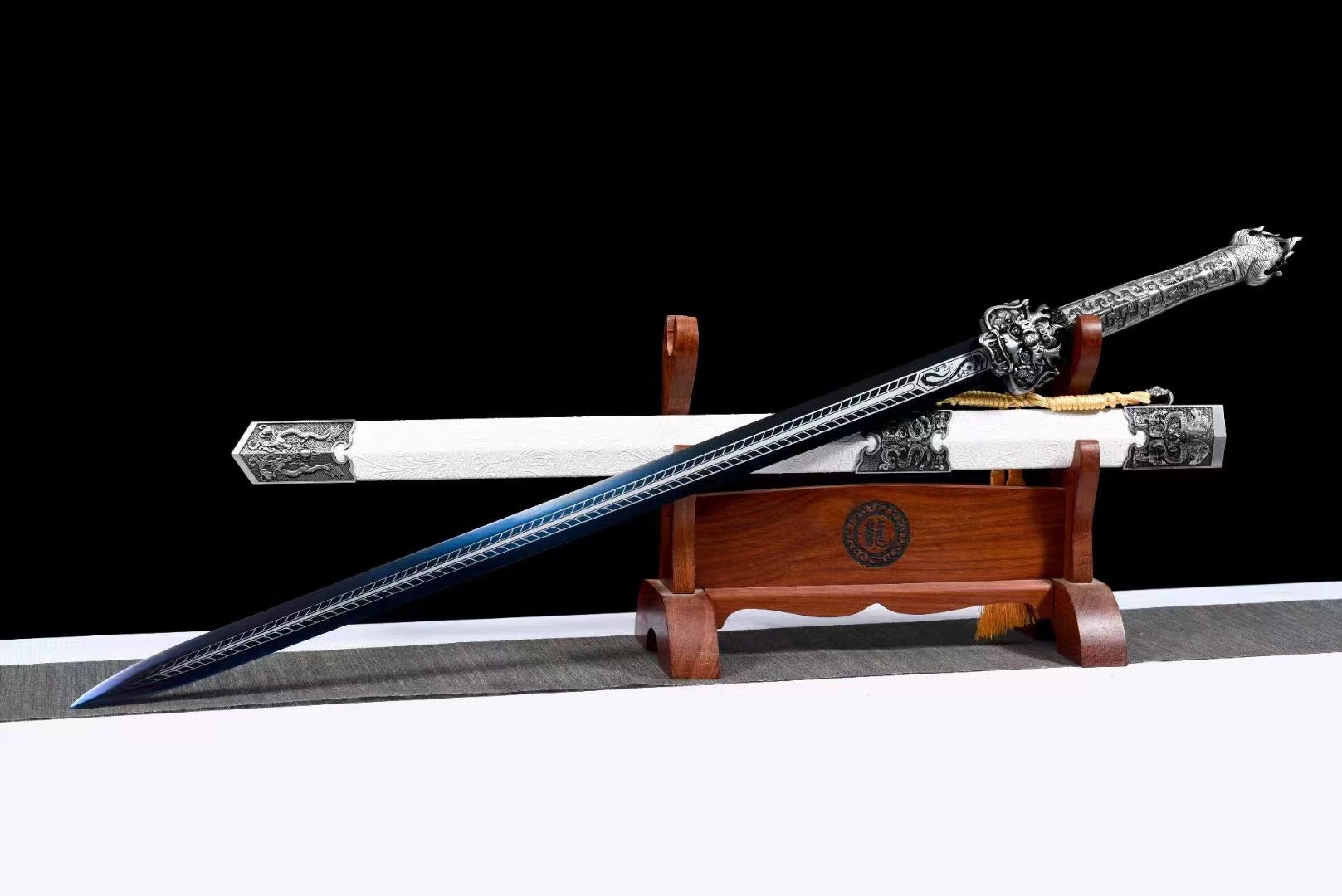 Blade material is pattern steel, with a hand-polished finish. The fittings are brass with inlays, and the scabbard is made of red sandalwood.